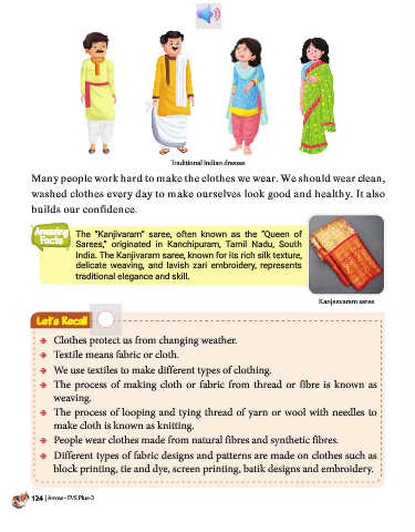 People wear clothes made from natural fibres and synthetic fibres.