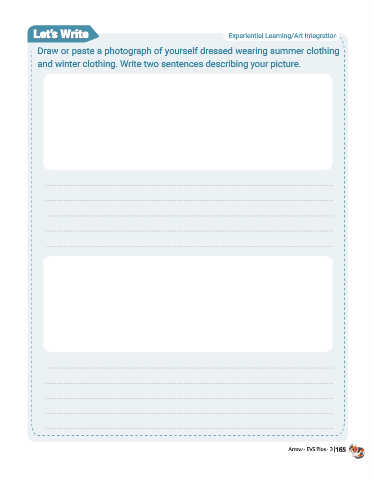 Let’s Write Experiential Learning/Art Integration Draw or paste a photograph of yourself dressed wearing summer clothing and winter clothing. Write two sentences describing your picture. 165 Arrow - EVS Plus - 3 | 165