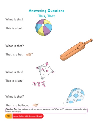 10 Arrow - Puffin - UKG-Semester-2 EnglishTeacher Tip: Help students to ask and answer questions with %u201cWhat is....?%u201d with more examples by using objects and role play. What is this? This is a ball.What is that?That is a bat.What is this? This is a kite.What is that?That is a balloon. Answering QuestionsThis, That