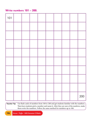 106 Arrow - Puffin - UKG-Semester-2 MathsTeacher Tip: Use flash cards of numbers from 100 to 200 and get students familiar with the numbers. Then have students pick a number and name it. After they are sure of the numbers, make them write the numbers. Follow the same method for numbers up to 500.Write numbers 101 %u2013 200.101200