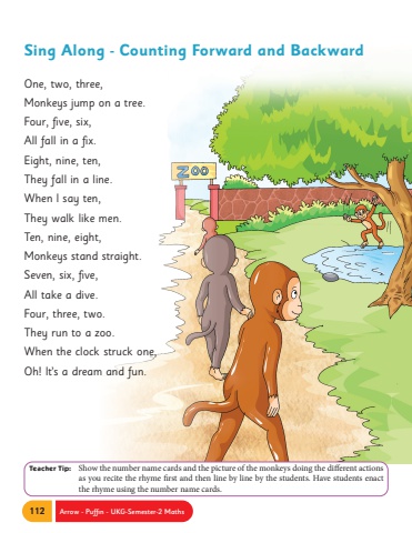 112 Arrow - Puffin - UKG-Semester-2 MathsSing Along - Counting Forward and BackwardOne, two, three,Monkeys jump on a tree.Four, five, six,All fall in a fix.Eight, nine, ten,They fall in a line.When I say ten,They walk like men.Ten, nine, eight,Monkeys stand straight.Seven, six, five,All take a dive.Four, three, two.They run to a zoo.When the clock struck one,Oh! It%u2019s a dream and fun.Teacher Tip: Show the number name cards and the picture of the monkeys doing the different actions as you recite the rhyme first and then line by line by the students. Have students enact the rhyme using the number name cards.