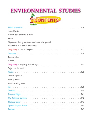 Plants around Us 114Trees, PlantsGrowth of a seed into a plantFruitsVegetables that grow above and under the groundVegetables that can be eaten rawSing Along %u2013 I am a Pumpkin 127Transport 128Fast vehiclesAirportSing Along %u2013 Stop says the red light 133Safety on the roadWater 135Sources of waterUses of waterAvoid wasting waterAir 138Seasons 139Day and Night 141Our National Symbols 142National Days 143Special Days at School 145Festivals 147CONTENTSENVIRONMENTAL STUDIES