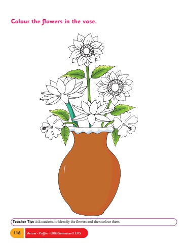 116 Arrow - Puffin - UKG-Semester-2 EVSTeacher Tip: Ask students to identify the flowers and then colour them. Colour the flowers in the vase.