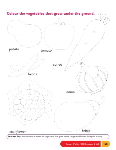 Arrow - Puffin - UKG-Semester-2 EVS 125Teacher Tip: Ask students to name the vegetables that grow under the ground before doing the activity.Colour the vegetables that grow under the ground.oniontomato potatocarrotbeanscauliflower brinjal