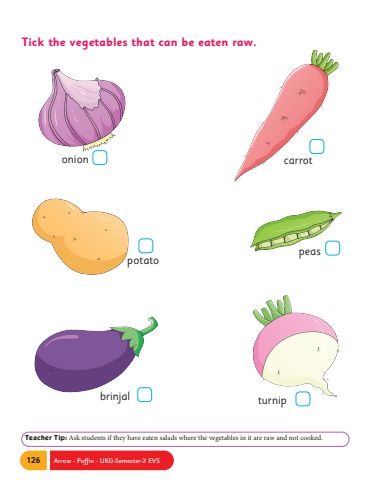 126 Arrow - Puffin - UKG-Semester-2 EVSTeacher Tip: Ask students if they have eaten salads where the vegetables in it are raw and not cooked.Tick the vegetables that can be eaten raw.carrotturnippeasonionpotatobrinjal