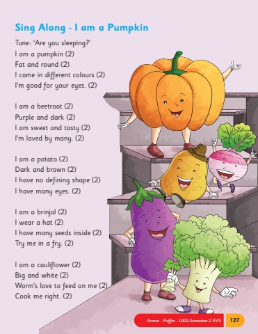 Arrow - Puffin - UKG-Semester-2 EVS 127Sing Along - I am a PumpkinTune: %u2018Are you sleeping?%u2019I am a pumpkin (2)Fat and round (2)I come in different colours (2)I%u2019m good for your eyes. (2)I am a beetroot (2)Purple and dark (2)I am sweet and tasty (2)I%u2019m loved by many. (2)I am a potato (2)Dark and brown (2)I have no defining shape (2)I have many eyes. (2)I am a brinjal (2)I wear a hat (2)I have many seeds inside (2)Try me in a fry. (2)I am a cauliflower (2)Big and white (2)Worm%u2019s love to feed on me (2)Cook me right. (2)Arrow - Puffin - UKG-Semester-2 EVS 127