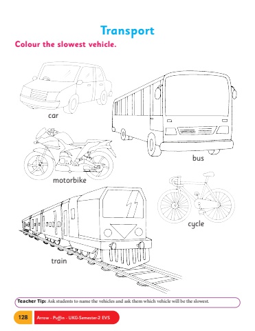 128 Arrow - Puffin - UKG-Semester-2 EVSTransport Colour the slowest vehicle.Teacher Tip: Ask students to name the vehicles and ask them which vehicle will be the slowest.carbusmotorbikecycletrain
