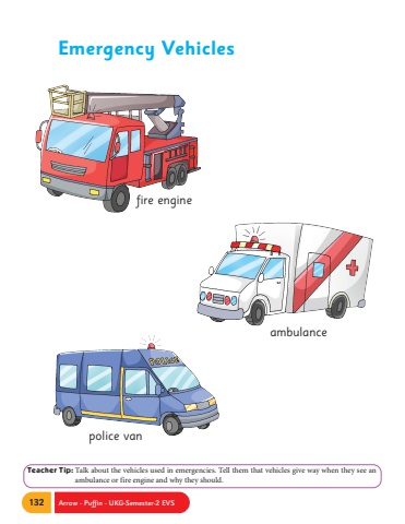 132 Arrow - Puffin - UKG-Semester-2 EVSTeacher Tip: Talk about the vehicles used in emergencies. Tell them that vehicles give way when they see an ambulance or fire engine and why they should. Emergency Vehiclesfire engineambulancepolice van