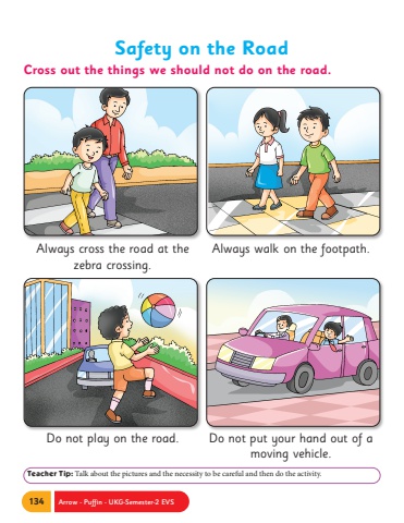 134 Arrow - Puffin - UKG-Semester-2 EVSTeacher Tip: Talk about the pictures and the necessity to be careful and then do the activity. Safety on the RoadCross out the things we should not do on the road.Always cross the road at the zebra crossing.Do not play on the road.Always walk on the footpath.Do not put your hand out of a moving vehicle.
