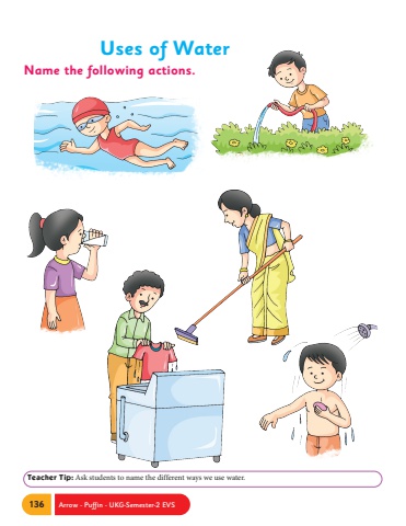 136 Arrow - Puffin - UKG-Semester-2 EVSTeacher Tip: Ask students to name the different ways we use water.Uses of WaterName the following actions.