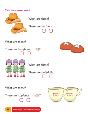 14 Arrow - Puffin - UKG-Semester-2 EnglishTick the correct word.What are these?These are hat/hats.What are those?Those are bun/buns.What are these?These are doll/dolls.What are those?Those are cup/cups.