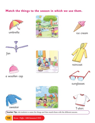 140 Arrow - Puffin - UKG-Semester-2 EVSTeacher Tip: Ask students to name the things and then match them with the different seasons. Match the things to the season in which we use them.umbrella fan a woollen cap sweater T-shirtsunglassesraincoatice cream