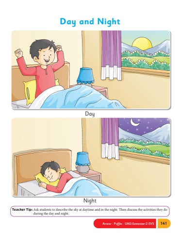 Arrow - Puffin - UKG-Semester-2 EVS 141Teacher Tip: Ask students to describe the sky at daytime and in the night. Then discuss the activities they do during the day and night.Day and NightDayNight