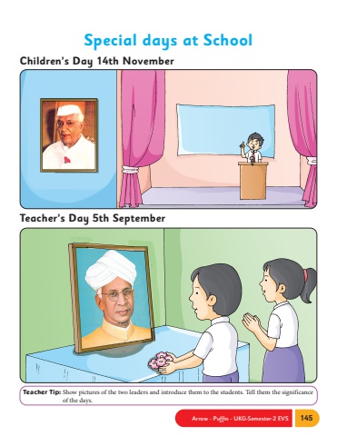 Arrow - Puffin - UKG-Semester-2 EVS 145Special days at SchoolTeacher Tip: Show pictures of the two leaders and introduce them to the students. Tell them the significance of the days. Teacher%u2019s Day 5th SeptemberChildren%u2019s Day 14th November