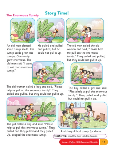 Arrow - Puffin - UKG-Semester-2 English 17Story Time!Teacher Tip: Enact the story with the students. An old man planted some turnip seeds. The turnip seeds grew into turnips. One turnip grew enormous. The old man said %u201cI want to eat that enormous turnip.%u201dHe pulled and pulled and pulled, but he could not pull it up.The boy called a girl and said, %u201cPlease help us pull this enormous turnip.%u201d They pulled and pulled but could not pull it up.The girl called a dog and said, %u201cPlease help us pull this enormous turnip.%u201d They pulled and they pulled and they pulled. Up, popped the enormous turnip. The old man called the old woman and said, %u201cPlease help me pull out the enormous turnip.%u201d They pulled and pulled, but they could not pull it up.And they all had turnip for dinner. The old woman called a boy and said, %u201cPlease help us pull up the enormous turnip%u201d. They pulled and pulled, but they could not pull it up.The Enormous Turnip