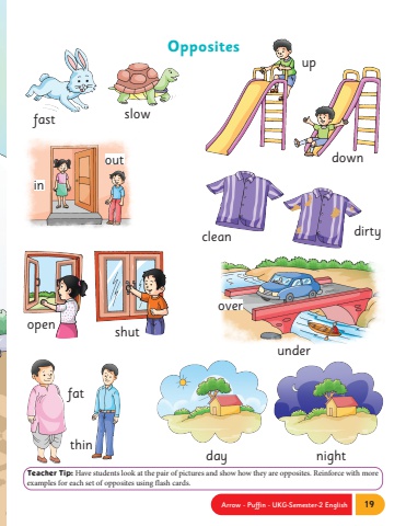 Arrow - Puffin - UKG-Semester-2 English 19Teacher Tip: Have students look at the pair of pictures and show how they are opposites. Reinforce with more examples for each set of opposites using flash cards.Oppositesfast slowupdownclean dirtyopen shutfatdaythinnightinoutoverunder