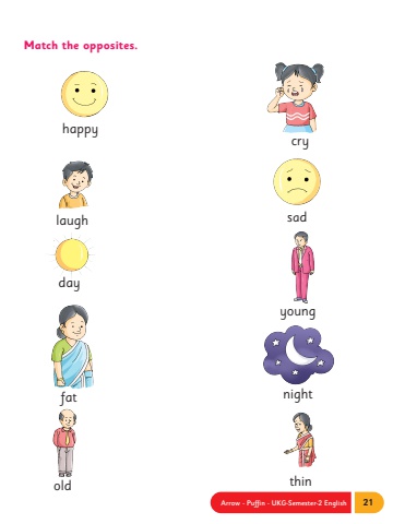 Arrow - Puffin - UKG-Semester-2 English 21Match the opposites.nightyoungsadcrythin oldfatdaylaughhappy