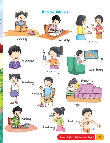 Arrow - Puffin - UKG-Semester-2 English 23Action Wordstalkinglaughingbathingwatchingwriting readingstandingsittinglisteningdrinkingeatingsleeping