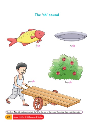 30 Arrow - Puffin - UKG-Semester-2 EnglishTeacher Tip: Ask students to circle the %u2018sh%u2019 at the end of the words. Then help them read the words.fish dishbush pushThe %u2018sh%u2019 sound