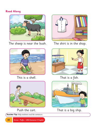 32 Arrow - Puffin - UKG-Semester-2 EnglishTeacher Tip: Help students read the sentences.Read AlongThe sheep is near the bush.This is a shell.The shirt is in the shop.That is a fish.Push the cart. That is a big ship.