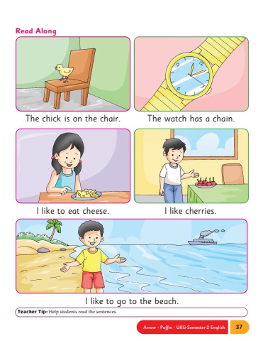 Arrow - Puffin - UKG-Semester-2 English 37Read AlongTeacher Tip: Help students read the sentences.The chick is on the chair.I like to eat cheese. I like cherries.The watch has a chain.I like to go to the beach.