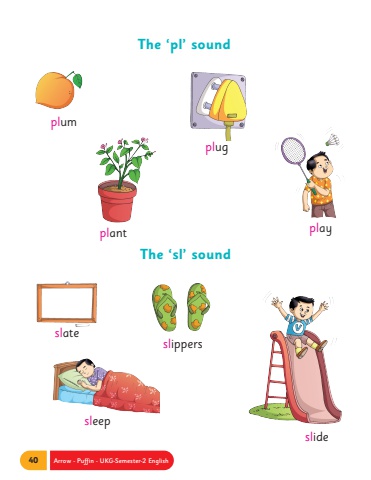 40 Arrow - Puffin - UKG-Semester-2 EnglishThe %u2018pl%u2019 soundThe %u2018sl%u2019 soundplumplugplant playsleepslateslippersslide
