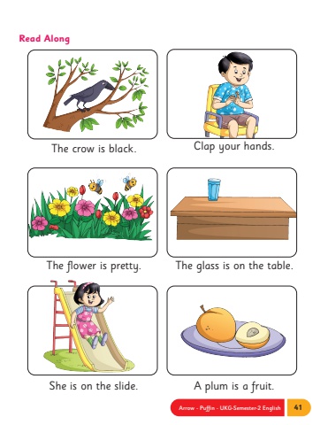 Arrow - Puffin - UKG-Semester-2 English 41Read AlongThe crow is black.The flower is pretty.She is on the slide.Clap your hands.The glass is on the table.A plum is a fruit.
