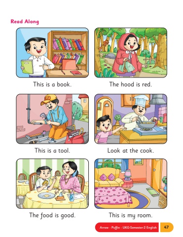 Arrow - Puffin - UKG-Semester-2 English 47Read AlongThis is a book.This is a tool.The food is good.The hood is red.Look at the cook.This is my room.