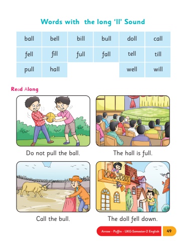 Arrow - Puffin - UKG-Semester-2 English 49Do not pull the ball.Call the bull.The hall is full.The doll fell down.Words with the long %u2018ll%u2019 Soundfell fill full fall tellball bell bill bull dollRead Alongtillcallpull hall well will