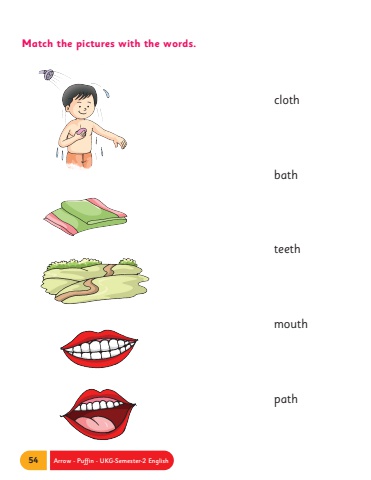 54 Arrow - Puffin - UKG-Semester-2 EnglishMatch the pictures with the words.clothbathteethmouth path