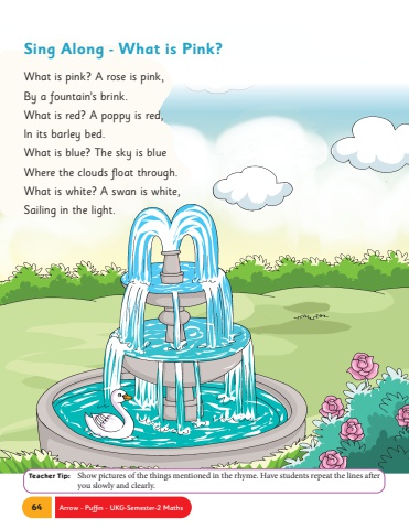 64 Arrow - Puffin - UKG-Semester-2 MathsTeacher Tip: Show pictures of the things mentioned in the rhyme. Have students repeat the lines after you slowly and clearly.Sing Along - What is Pink?What is pink? A rose is pink,By a fountain%u2019s brink.What is red? A poppy is red,In its barley bed.What is blue? The sky is blueWhere the clouds float through.What is white? A swan is white,Sailing in the light.