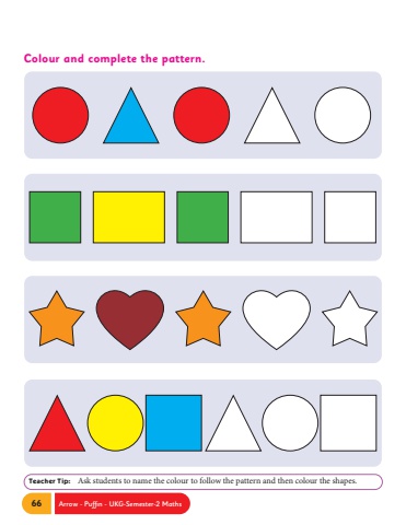 66 Arrow - Puffin - UKG-Semester-2 MathsColour and complete the pattern.Teacher Tip: Ask students to name the colour to follow the pattern and then colour the shapes.