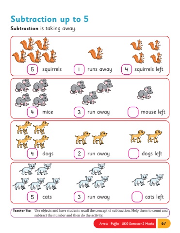 Arrow - Puffin - UKG-Semester-2 Maths 67Subtraction up to 5 Subtraction is taking away.squirrels runs away squirrels leftmice run away mouse leftdogs run away dogs leftcats run away cats leftTeacher Tip: Use objects and have students recall the concept of subtraction. Help them to count and subtract the number and then do the activity.