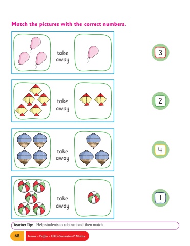 68 Arrow - Puffin - UKG-Semester-2 MathsMatch the pictures with the correct numbers.take awaytake awaytake awaytake awayTeacher Tip: Help students to subtract and then match.
