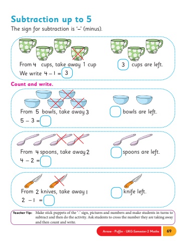 Arrow - Puffin - UKG-Semester-2 Maths 69Subtraction up to 5The sign for subtraction is %u2018%u2013%u2019 (minus).Count and write.From cups, take away 1 cup cups are left.We write %u2013 = From bowls, take away bowls are left. %u2013 = From spoons, take away spoons are left. %u2013 = From knives, take away knife left. %u2013 = Teacher Tip: Make stick puppets of the %u2018-%u2019 sign, pictures and numbers and make students in turns to subtract and then do the activity. Ask students to cross the number they are taking away and then count and write.