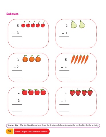70 Arrow - Puffin - UKG-Semester-2 MathsSubtract.%u2013 %u2013 %u2013 %u2013 %u2013 %u2013 Teacher Tip: Use the blackboard and draw the fruits and show students the method to do the activity.