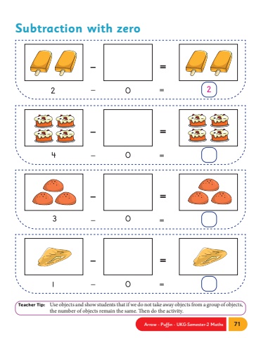 Arrow - Puffin - UKG-Semester-2 Maths 71Subtraction with zero%u2013 = %u2013 = %u2013 = %u2013 =%u2013 = %u2013 = %u2013 = %u2013 = Teacher Tip: Use objects and show students that if we do not take away objects from a group of objects, the number of objects remain the same. Then do the activity.