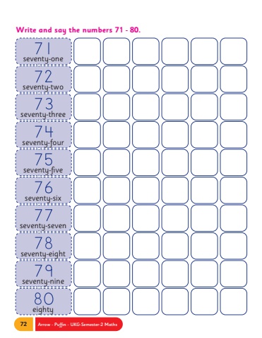 72 Arrow - Puffin - UKG-Semester-2 Mathsseventy-oneseventy-twoseventy-threeseventy-fourseventy-fiveseventy-sixseventy-sevenseventy-eighteightyseventy-nineWrite and say the numbers 71 - 80.