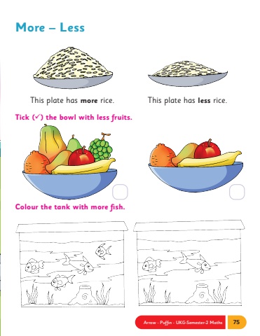 Arrow - Puffin - UKG-Semester-2 Maths 75More %u2013 LessColour the tank with more fish.Tick (%u00fc) the bowl with less fruits. This plate has more rice.This plate has less rice.