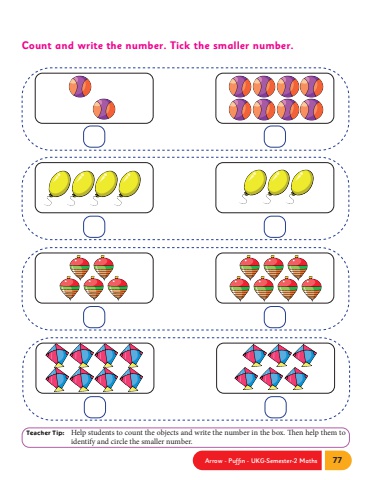 Arrow - Puffin - UKG-Semester-2 Maths 77Count and write the number. Tick the smaller number.Teacher Tip: Help students to count the objects and write the number in the box. Then help them to identify and circle the smaller number.