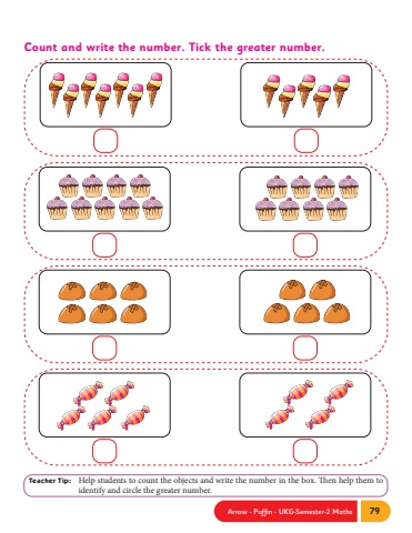 Arrow - Puffin - UKG-Semester-2 Maths 79Count and write the number. Tick the greater number.Teacher Tip: Help students to count the objects and write the number in the box. Then help them to identify and circle the greater number.