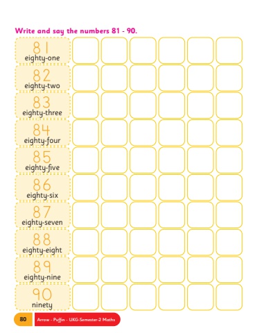 80 Arrow - Puffin - UKG-Semester-2 MathsWrite and say the numbers 81 - 90.eighty-oneeighty-twoeighty-threeeighty-foureighty-fiveeighty-sixeighty-seveneighty-eightninetyeighty-nine