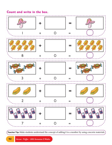 92 Arrow - Puffin - UKG-Semester-2 MathsCount and write in the box.+ = + = Teacher Tip: Make students understand the concept of adding 0 to a number by using concrete materials.+ = + = + = + = + = + = + = + =