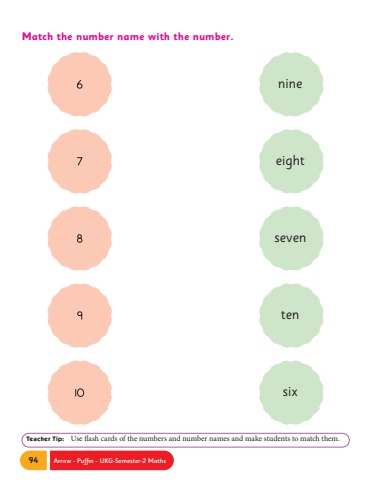94 Arrow - Puffin - UKG-Semester-2 MathsMatch the number name with the number.nineeightseventensixTeacher Tip: Use flash cards of the numbers and number names and make students to match them.