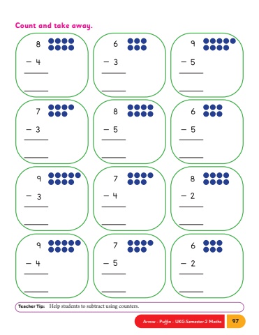 Arrow - Puffin - UKG-Semester-2 Maths 97Count and take away.%u2013 %u2013 %u2013 %u2013 %u2013 %u2013 %u2013 %u2013 %u2013 %u2013 %u2013 %u2013 Teacher Tip: Help students to subtract using counters.